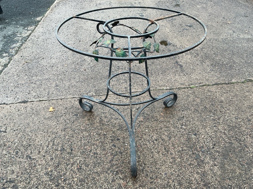A circular wrought iron table base or pot stand, the top with ivy leaf decoration on three scrolled legs. (28in x 26.75in)