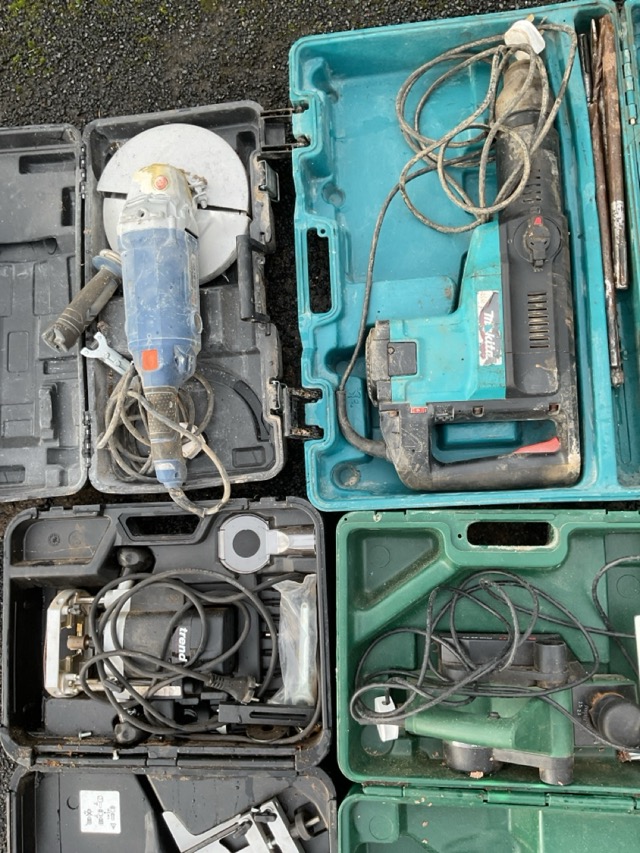 Four cased power tools - a Bosch planer, a Makita hammer drill with bits, a Dexter angle grinder/cutter and a Trend router. (4)