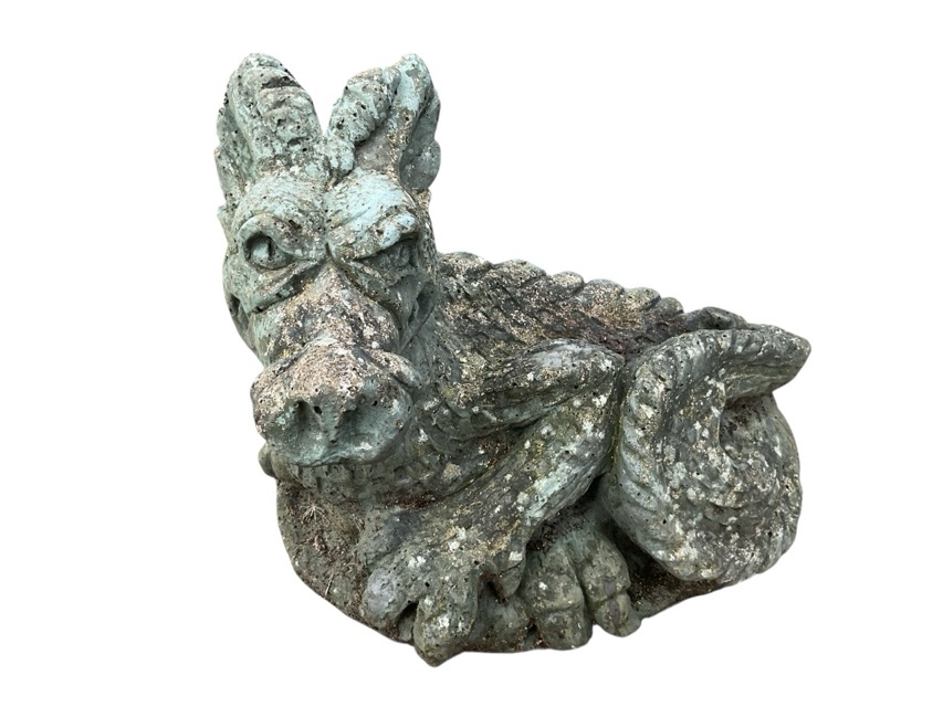 A painted composition stone garden dragon with curled tail. (13.5in)