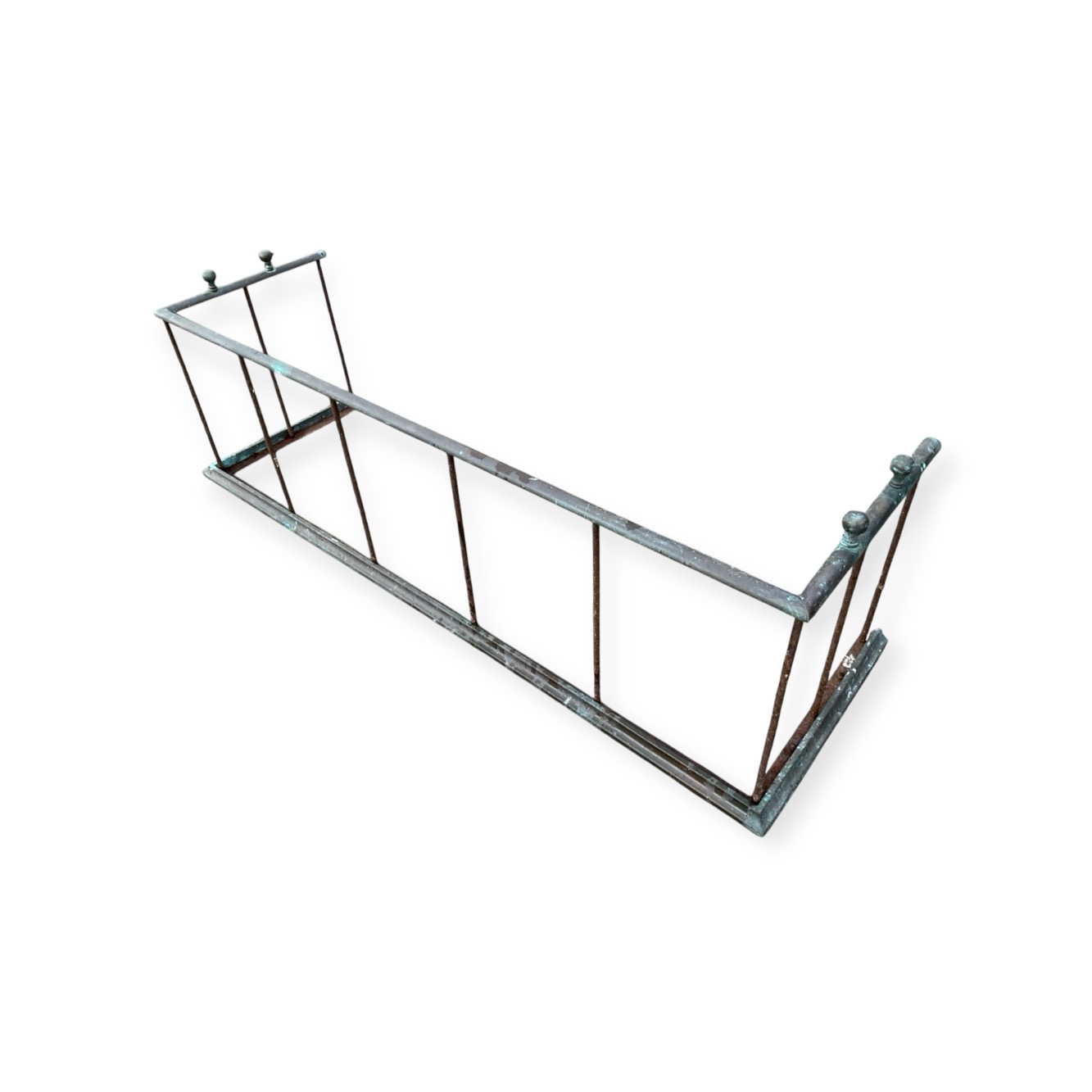 A nineteenth century copper fender with D-shaped rail on iron spindles above a moulded copper curb. (47in x 14.5in)