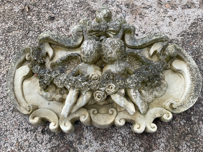 A composition stone garden wall plaque, the panel of classical scrolled form framing winged cherubs with garland beneath ribbon bow. (19in)