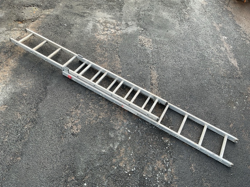 A Hailo aluminium two-part extending ladder with eighteen square section rungs. (15ft 8in max)