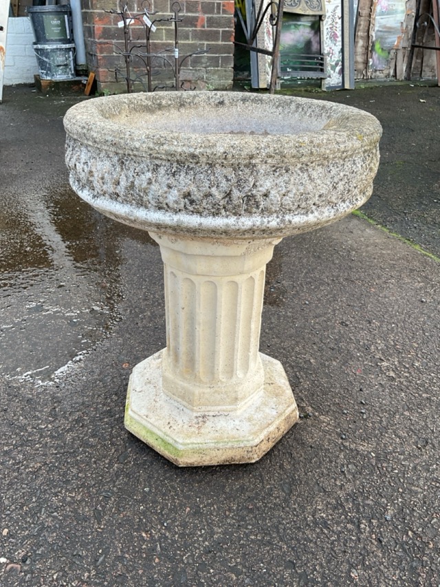 A composition stone garden birdbath with circular leaf moulded bowl on a fluted column above octagonal base. (18.25in)