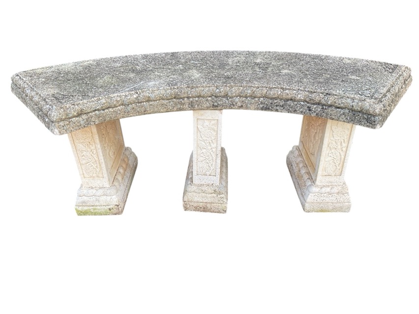 A composition stone garden bench with curved rope moulded seat raised on three rectangular flowerhead cast supports with ropetwist moulded bases. (47.5in x 17in)