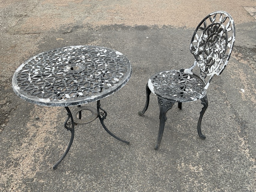 A cast metal garden table with pierced circular top on tripartite outswept legs joined by a ring stretcher, and a matching chair with pierced balloon back and circular seat raised on cabriole legs. (2)
