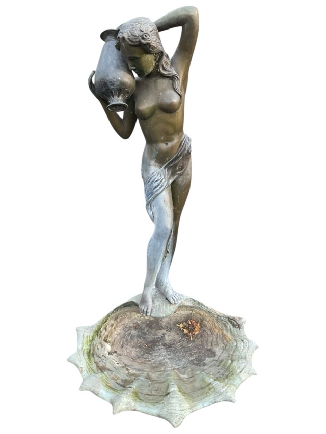 A bronze garden fountain cast as a draped water nymph with pitcher standing on a scallop shell. (55.5in)