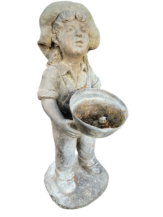A bronze garden fountain cast as a small boy holding bowl containing the water spout. (24in)