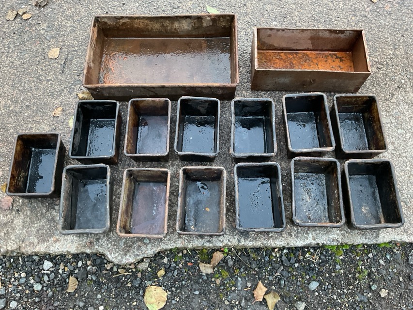 Thirteen 6.5in bread loaf baking tins; and two others - rectangular & larger. (15)