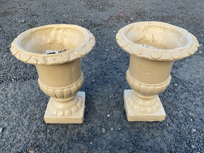 Six urn shaped plastic flower pots - vine embossed, faux terracotta, a pair, etc. (6)