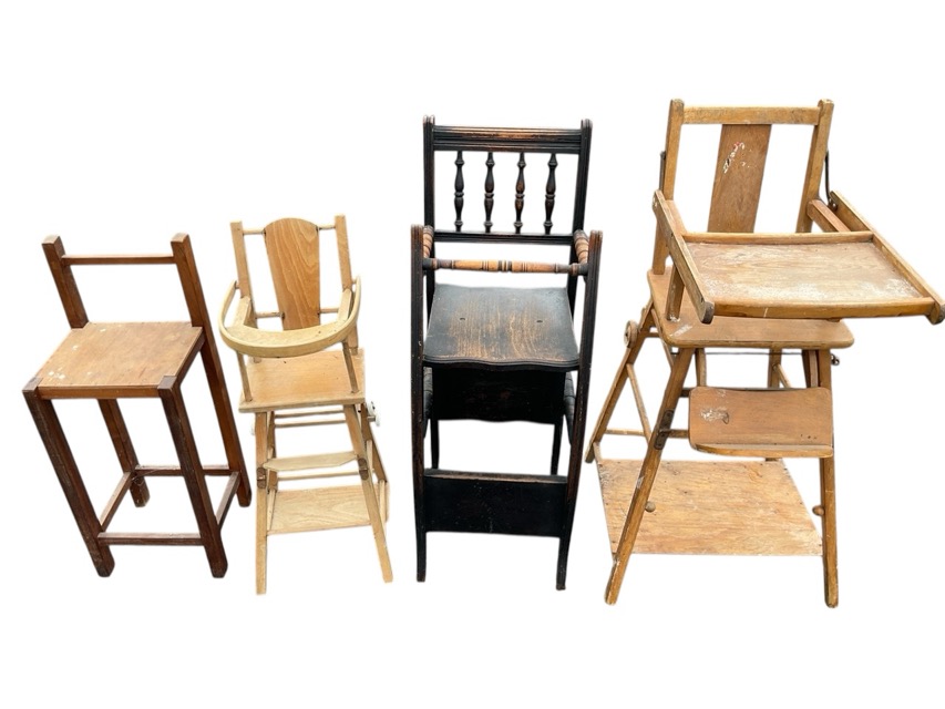 A Victorian oak highchair, and a beech highchair, both converting to a wheeled play tables; a similar dolls convertible chair; and a scratch built tall stool. (4)