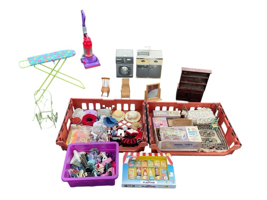 Miscellaneous dolls furniture, toys & accessories - a Dyson hoover, a hotpoint kitchen set, playfood kit, a boxed little hostess dining table and chairs, a wirework bed, sideboard, dressing table, rocking chairs, a rug, Bratz, dolls clothing & hats, etc. (A lot)