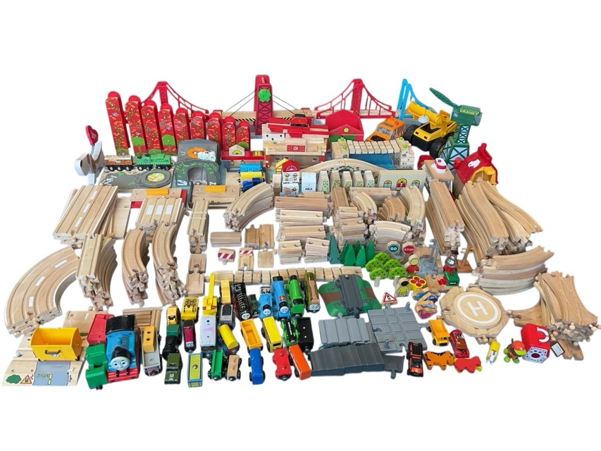 A large collection of BigJig tracks - bridges, ramps, crossings, stations, houses, rail tracks, roads, signs, trains & carriages with Thomas the Tank; and other miscellaneous toys, a Brio ferry, crane, diggers, Hot wheels, etc. (A lot)
