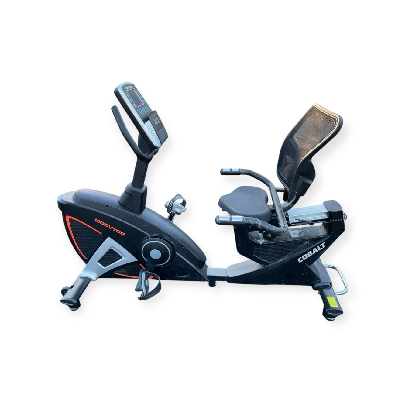 A Cobalt Moovyou exercise machine of armchair bicycle form having electronic dashboard and adjustable seat, raised on castors. (65in)