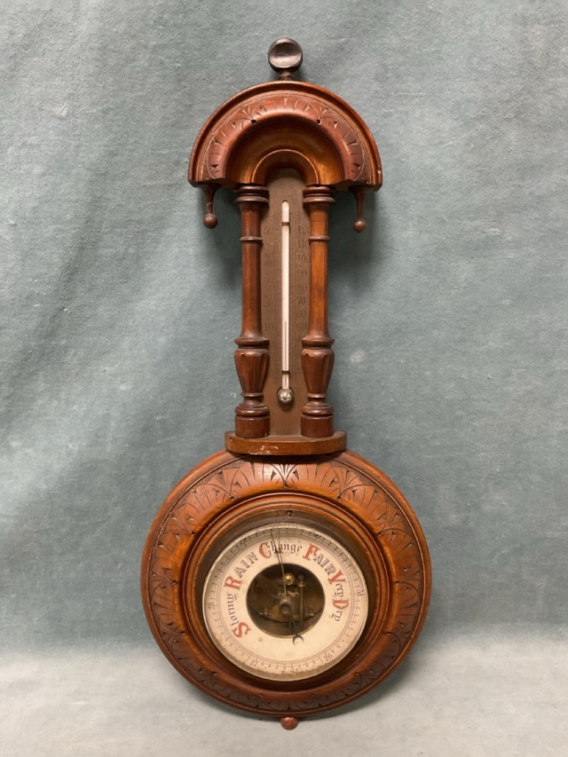 A Victorian mahogany cased hall barometer/thermometer with arched crest, turned columns and circular frame to enamelled dial with brass bezel. (19.5in)