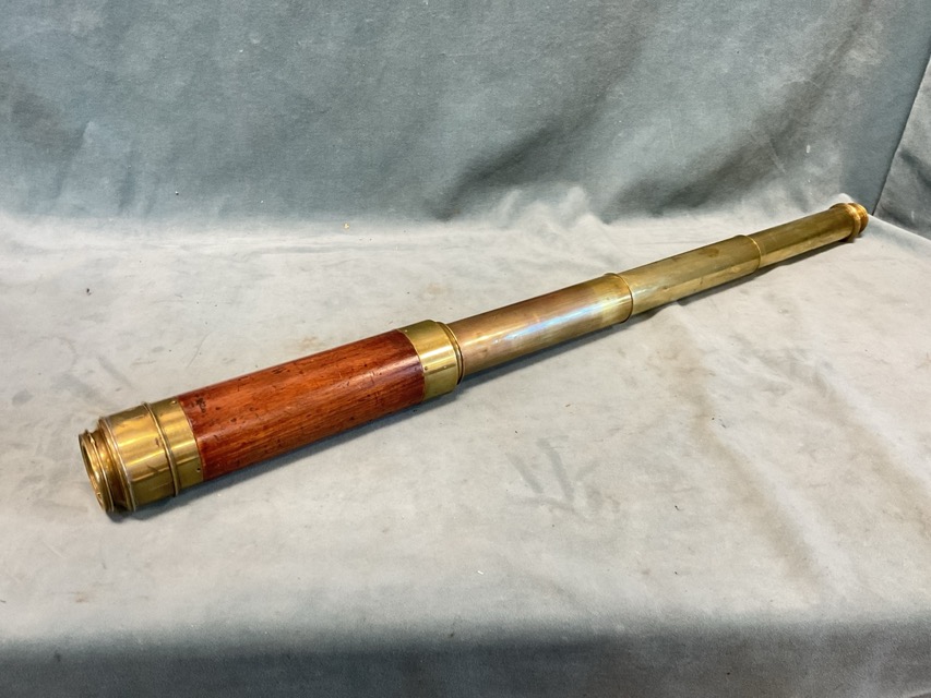 A Victorian mahogany mounted brass three-draw day & night telescope by JP Cutts of London c.1840, with integral sliding lens covers. (33in)