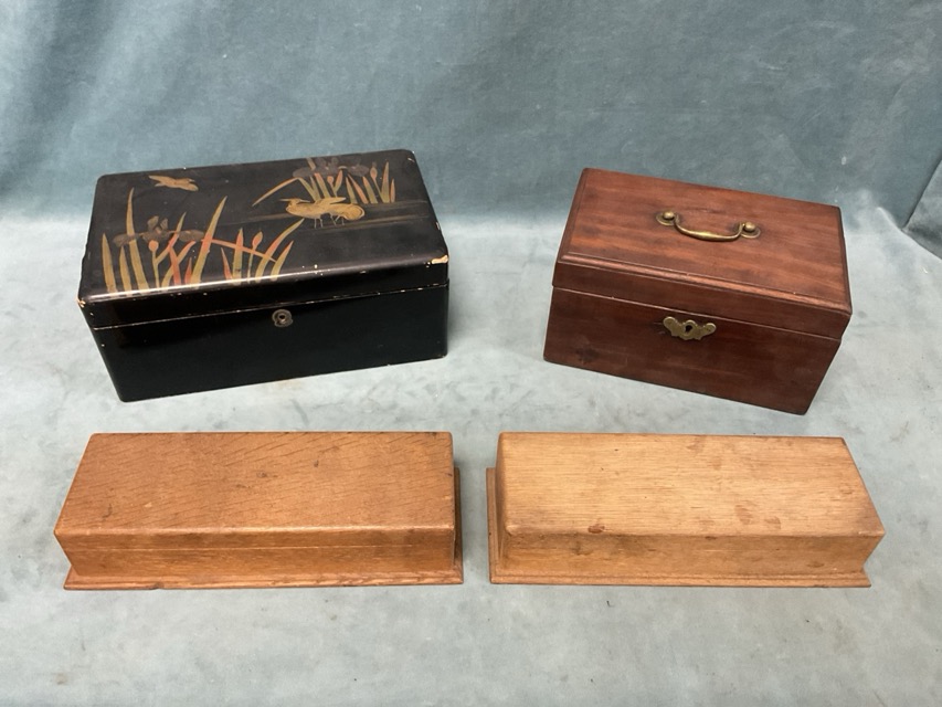 A Georgian mahogany box with internal tray having brass escutcheon and handle; a pair of rectangular oak boxes on plinths; and a Japanese lacquered box with cover decorated with gilt birds & lilies. (4)
