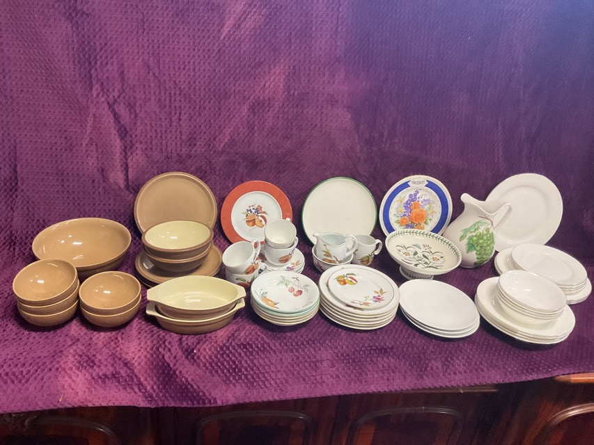 A Royal Worcester tea/dinner service in the Evesham pattern; a Royal Worcester porcelain dinner set in the Serendipity Platinum pattern; a Denby stoneware set; and miscellaneous ceramcs - Portmeirion, etc. (A lot)