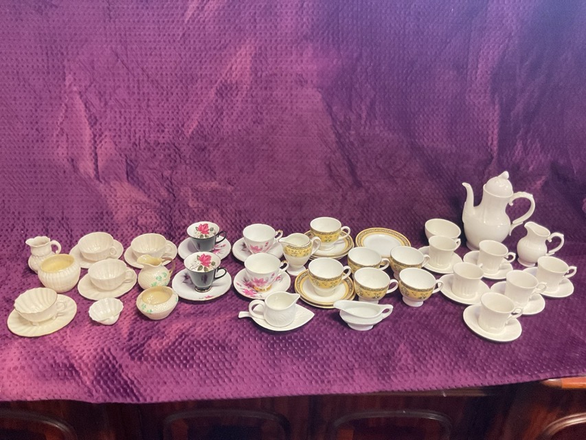 A collection of Belleek - shamrock decorated cups & saucers, shell moulded cup & saucer, etc; a Wedgwood six-piece teaset in India floral pattern; a Royal Doulton six-piece coffee set; and other ceramics, etc. (A lot)