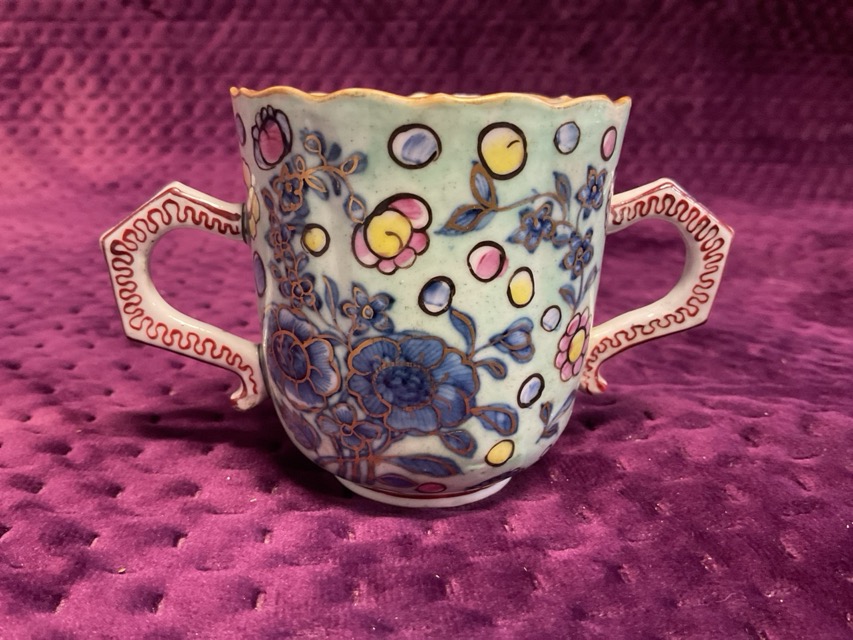 An C18th Chinese twin handled cup with scalloped rim and blue floral dedecoration, having clobbered overglaze gilt decoration. (2.75in)