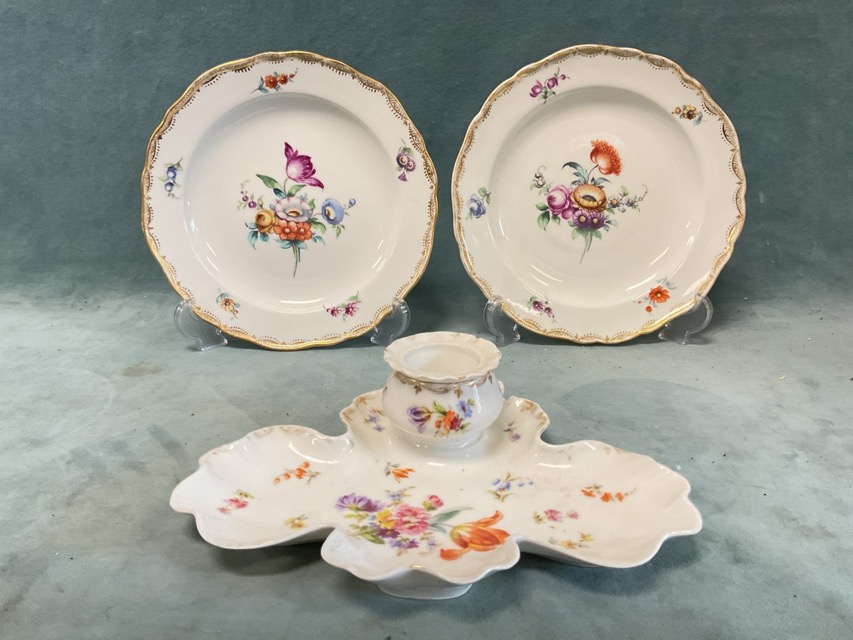 A pair of Meissen floral plates with scalloped gilt rims painted with poychrome floral sprigs - crossed swords marks; and a continental leaf shaped desk inkstand with floral decoration. (3)