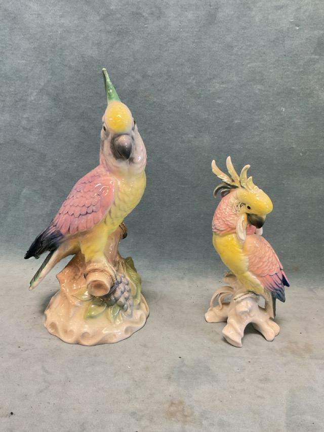 An Austrian porcelain parrot figurine; and another similar by Karl Ens - Volkstedt. (10.5in & 7.5in) (2)