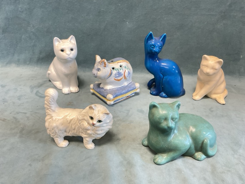 A collection of ceramic cats - Beswick, Portuguese handpainted faience, Italian turquoise glaze, and matt glazed, etc. (6)