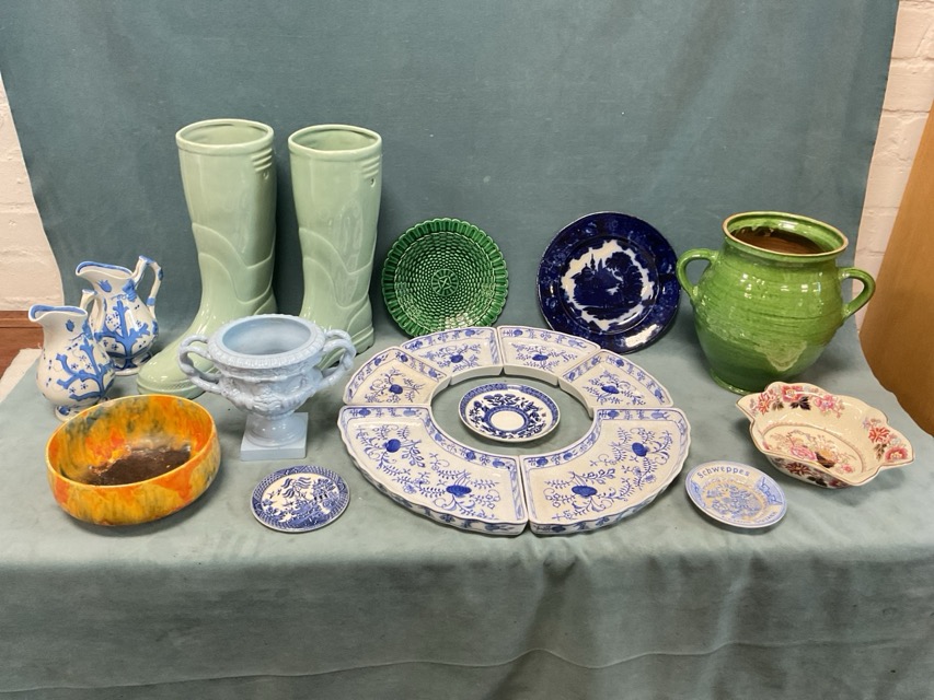 Miscellaneous ceramics - a Villeroy & Boch sectional onion pattern hors d’oeuvres dish, a Victorian Warwick vase, a pair of green wellie vases, a pair of Victorian jugs, a majolica plate, a Spanish glazed terracotta pot, etc. (A lot)