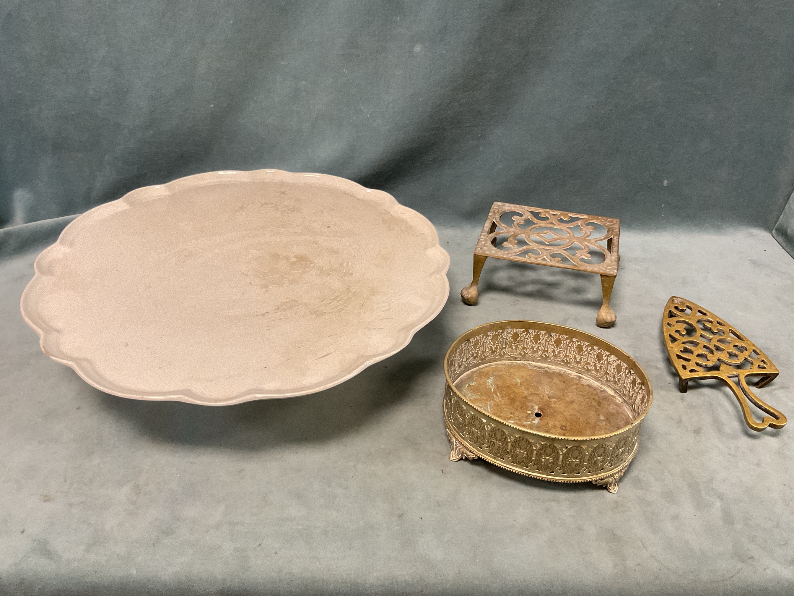 A Victorian ceramic lazy susan with scalloped circular top rotating on a domed base; two Victorian pierced brass trivets; and an oval silver plated cruet stand with pierced sides. (4)