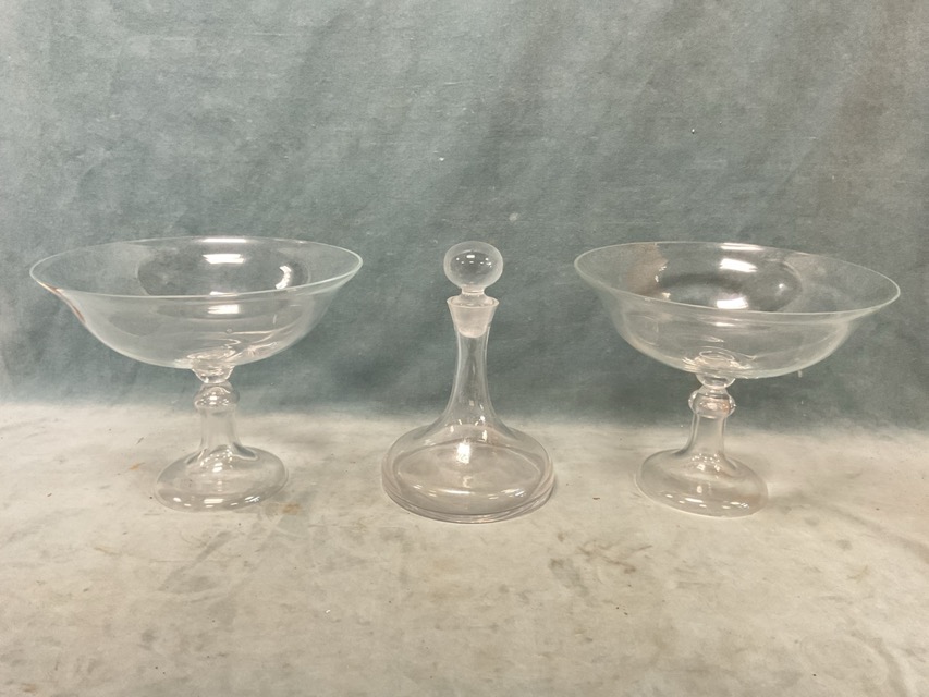 A pair of large glass tazzas with flared ogee bowls raised on hollow knopped stems with domed bases; and a ships decanter by LSA International with ball stopper and waisted neck. (3)