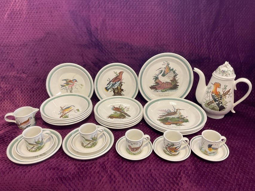 A Portmeirion dinner & coffee set decorated in the Birds of Britain pattern - bowls, plates, mugs, coffee pot & cover, etc. (A lot)