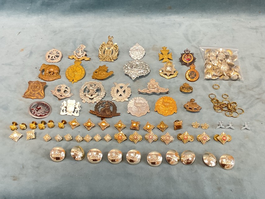 A collection of military cap badges, buttons and shoulder pips including Argyll & Sutherland Highlanders, Royal Artillery, West Riding, Royal Sussex, British American, Small Arms School, Lancashire, Royal Corps of Transport, British Asian, First Life Guards, French Foreign Legion, etc. (A lot)