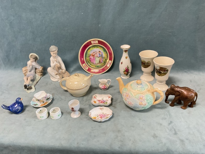 Miscellaneous ceramics - Lladro figurines, a Vienna style plate, an Avon Ware moulded teapot, a deco Woods Chandos teapot, Royal Albert Old Country Roses vase, pair of Palissy hunt goblets, Royal Crown Derby pin dishes, Coalport napkin rings, etc. (A lot)