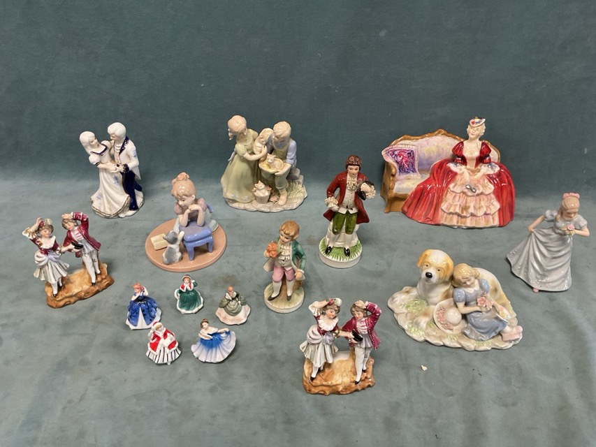 A Royal Doulton figurine - Bell o’ the Ball; and miscellaneous other porcelain figurines - mainly continental, pairs, Lladro style children, etc. (15)