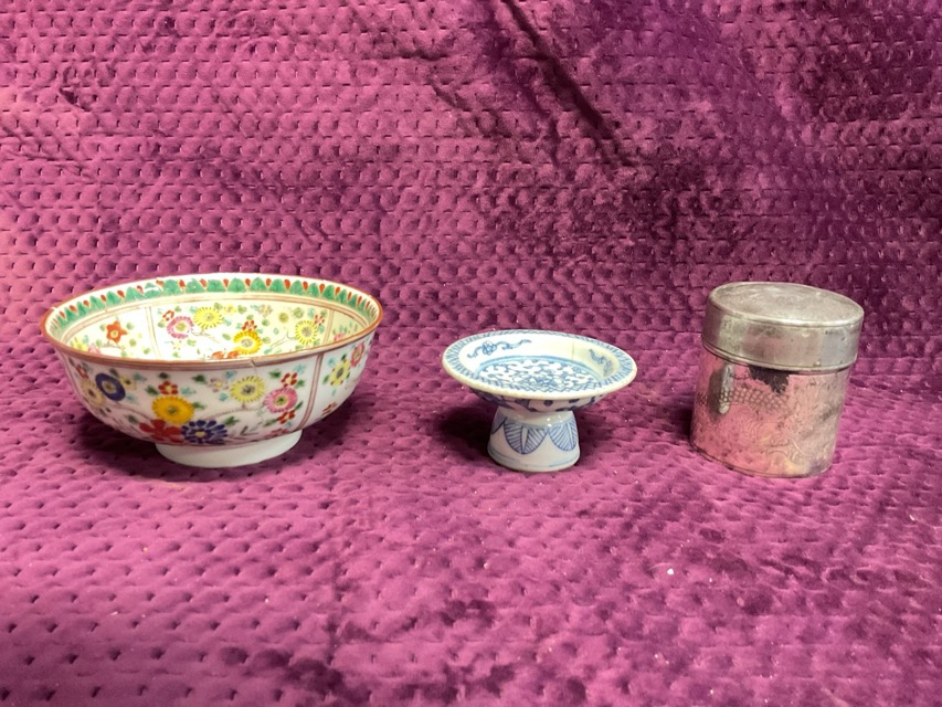 A Japanese Arita porcelain bowl enamelled with colourful birds and blossoming branches; a C19th Chinese blue & white porcelain footed stand decorated with scrolling foliage; and a Chinese Swatow pewter cylindrical covered jar engraved with dragons. (3)