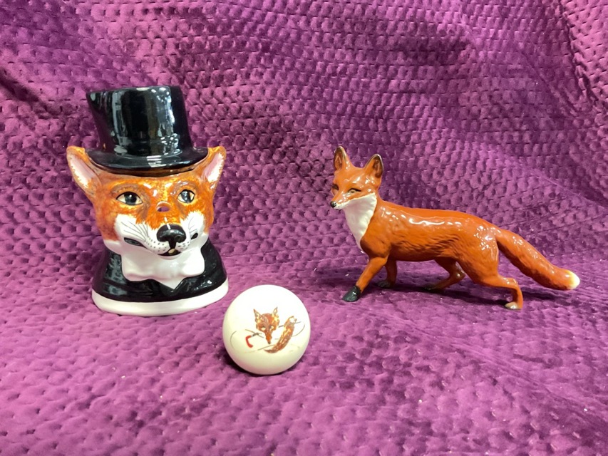 A handpainted Babbacombe Pottery string dispenser in the form of a fox bust in hunting attire - 6.75in; a Beswick walking fox; and a Victorian ceramic knob handpainted with a fox head, brush and whip. (3)