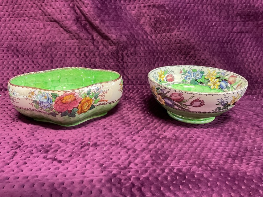 A Maling green lustre quatrefoil fruit bowl in the Peony Rose pattern, and a similar Maling circular bowl in the Springtime pattern. (2)