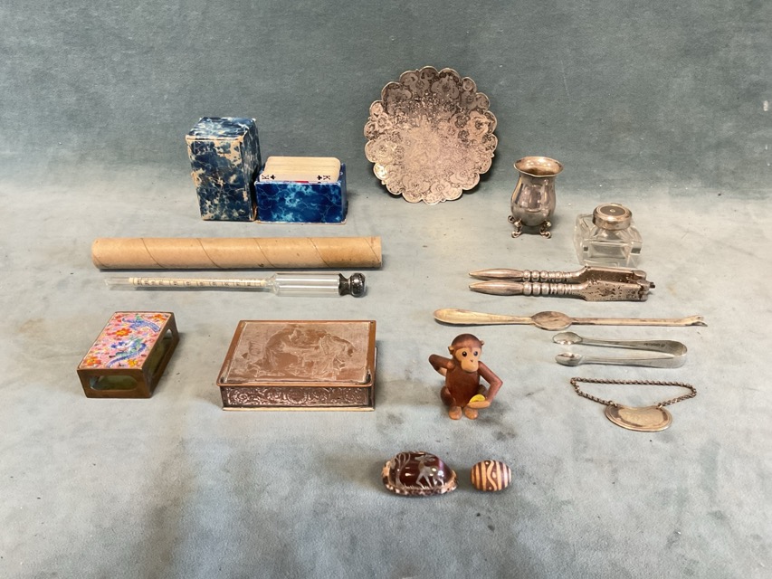 Miscellaneous items - a Chinese enamelled matchbox case, a French snuff box, an EPNS lobster pick, a circular eastern dish, an inkwell, a vase on scrolled feet, a box of patience cards, a carved shell, etc. (A lot)