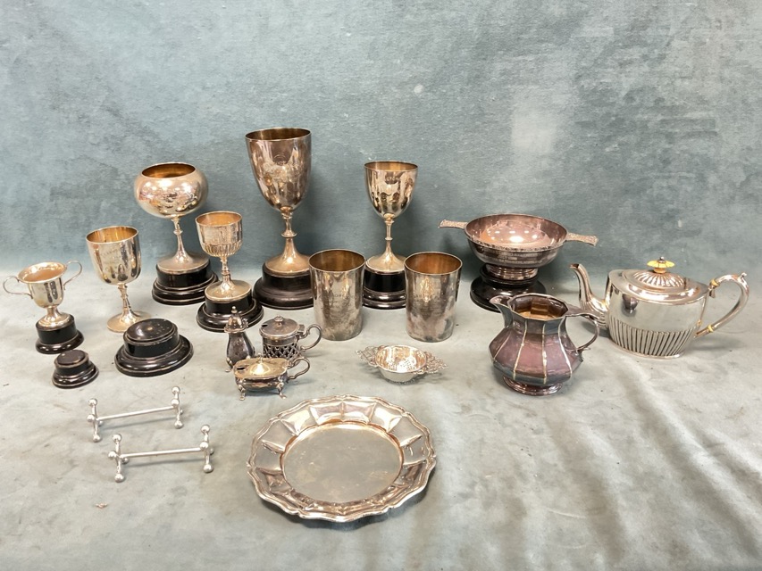 Miscellaneous silver plate - a ribbed bachelors teapot, a celtic quaiche, a chamfered jug, cruets, a pair of knife rests, a tea strainer, etc; and a collection of EPNS trophy cups on stands & two beakers. (A lot)