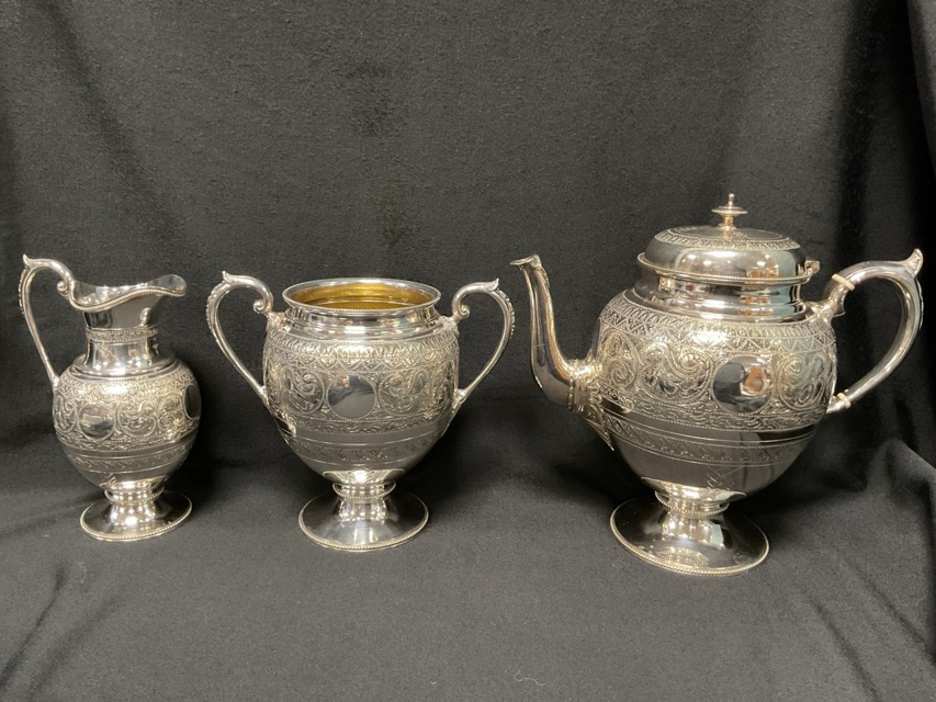 An Anglo-Indian silver plated tea set, with engraved & embossed foliate decoration, raised on waisted circular bases. (3)