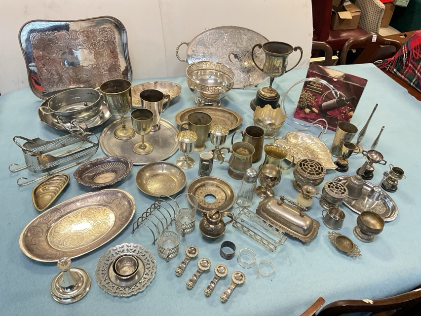 Miscellaneous silver plate - trays, trophy cups, bowls, bottle cradles, dishes, flower vases, tankards, a toast rack, a bell, etc. (A lot)