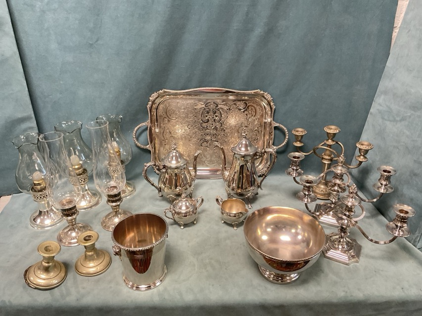 A quantity of silver plate - a foliate engraved drinks tray, a four-piece teaset, a pair of candelabra, an ice bucket, candlesticks, a rose bowl, etc. (A lot)
