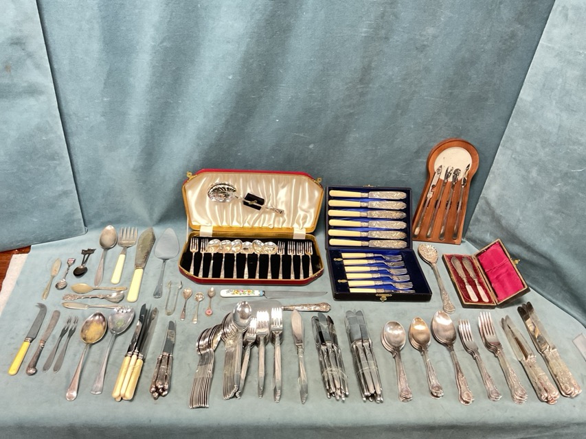 Miscellaneous cutlery - silver plated, cased sets, a long set of German Eickhorn stainless steel, a dessert set, servers, etc. (A lot)