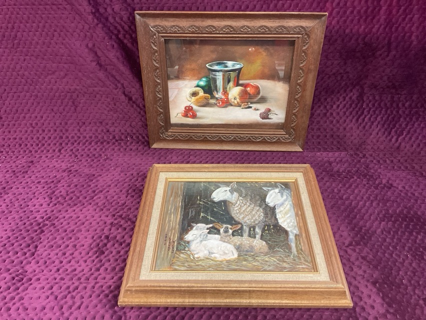 Cathie Lennox Wilson, oil on board, study of sheep & lambs, signed & framed; and an oil on board still life, fruit & silver cup, unsigned, in carved mahogany frame. (2)