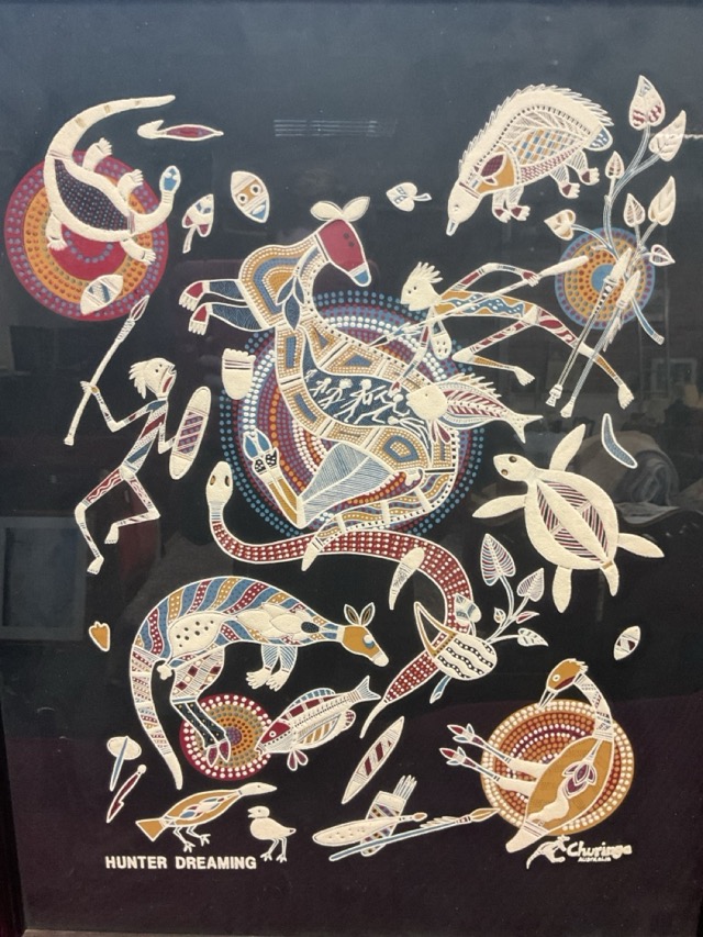 Churinga, Aboriginal Australian fabric picture with stylised motifs, titled Hunter Dreaming, signed on cloth & framed. (21.25in x 27in)