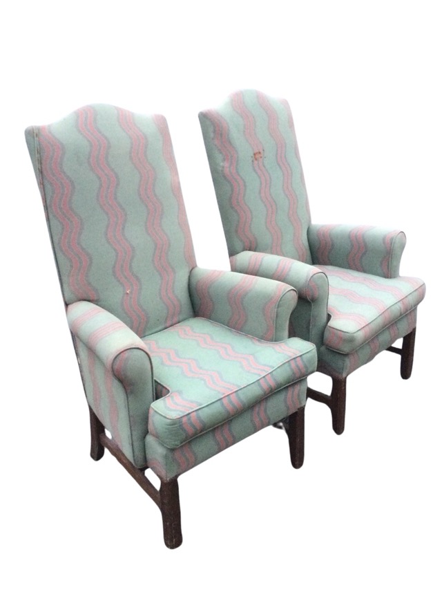A pair of Georgian style upholstered armchairs, the tall arched backs above seats with loose cushions flanked by outscrolled arms, raised on moulded square legs. (2)
