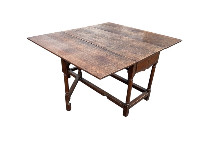 A Georgian rectangular oak gateleg dining table with two leaves opening on gate legs above friezes with dummy drawers, raised on turned column legs joined by stretchers. (57in x 50in x 29in)