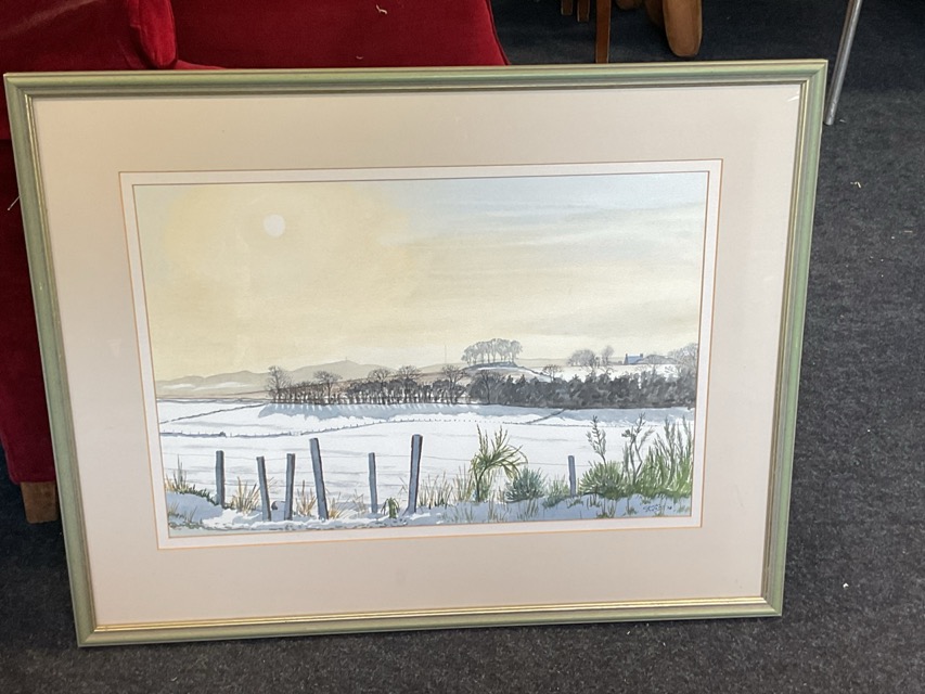 Charles Adams, watercolour, winter landscape, titled Sunshine and Snow to verso, signed, dated, mounted, and framed. (21in x 14.25in)