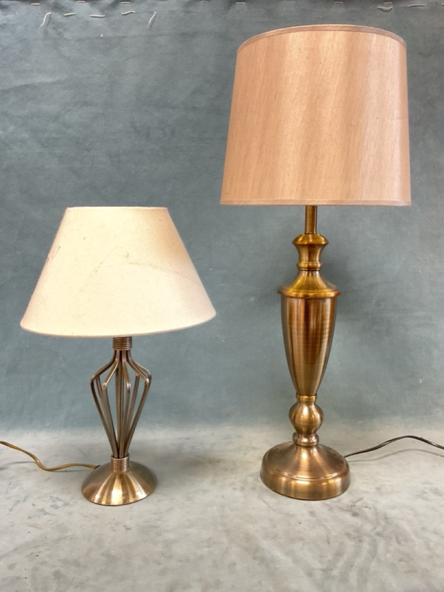 A patinated brass tablelamp with open cage baluster column on a domed circular base, with fabric shade; and another taller with vase shaped column on a flared circular base, with fabric shade. (2)