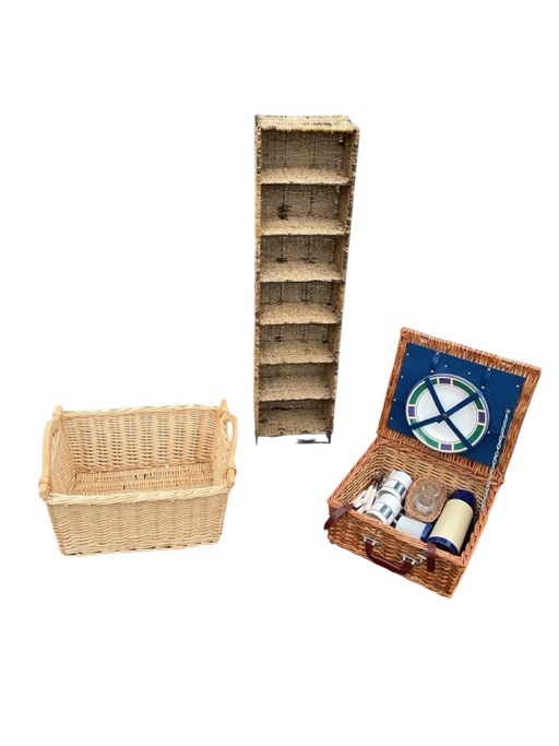 An unused picnic basket with mugs, plates, glasses, cutlery, thermos, etc; a rectangular basket with arched hardwood handles; and a wire framed woven seagrass seven-tier shelf. (3)