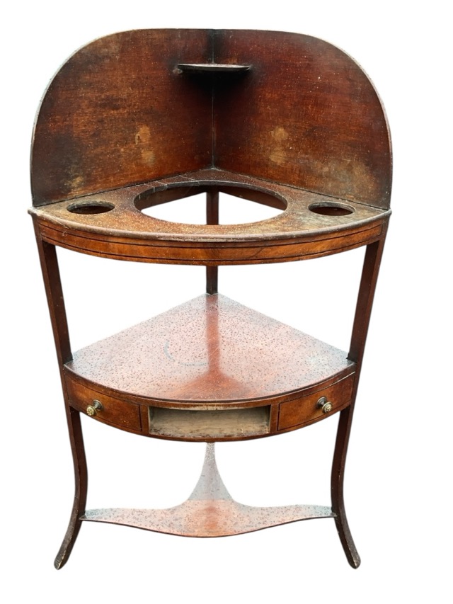 A Georgian mahogany bowfronted corner washstand with shaped back above shelf pierced for bowls, the mid-tier platform having absent central drawer, raised on square splayed legs united by stretcher. (22.5in x 15.25in x 43in)
